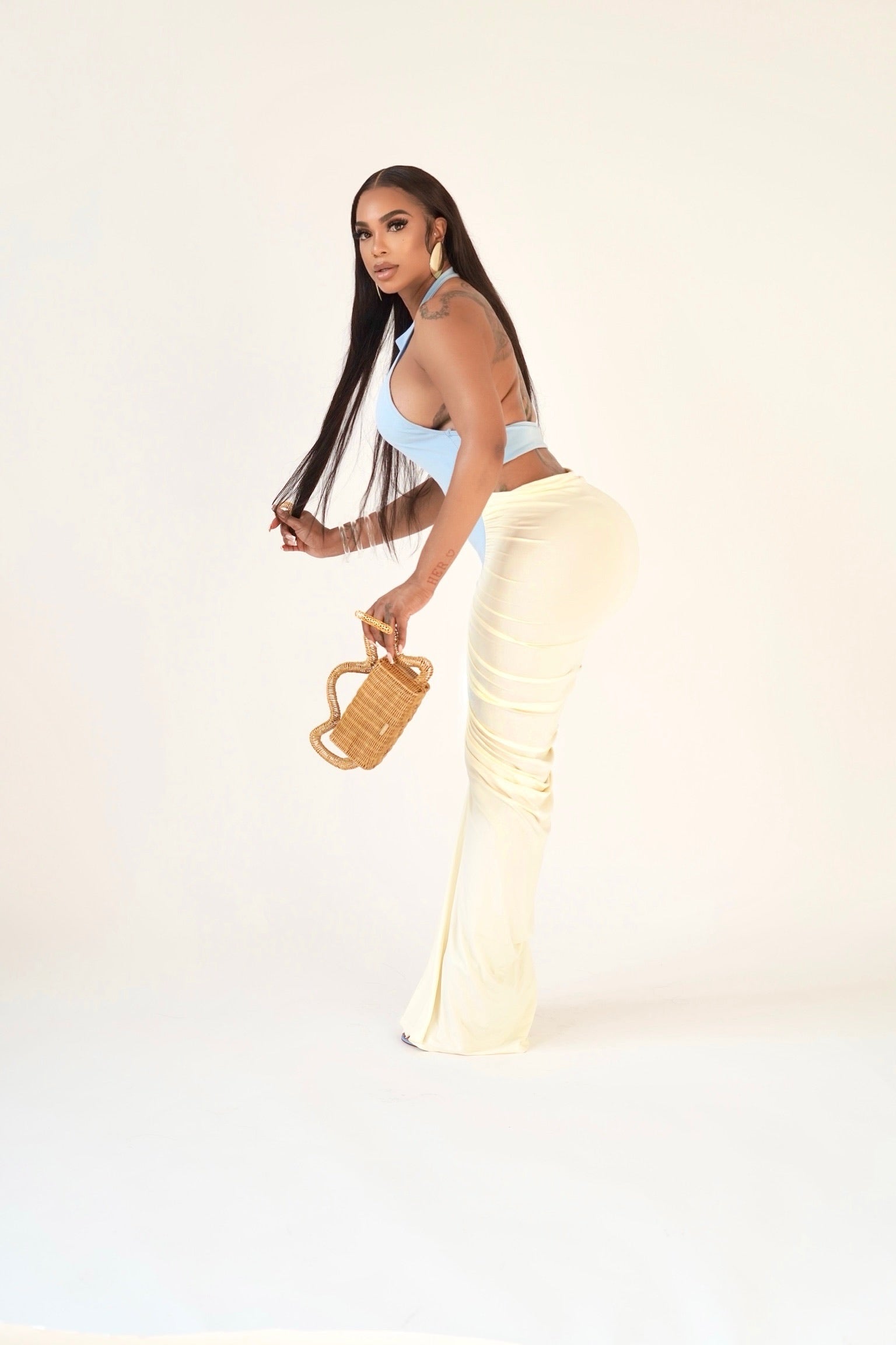 A sleeveless bodycon maxi dress in soft sky blue, contrasted with cream ruched panels along the hips and a front slit for movement. The sleek halter neckline and contour fit make it a sophisticated statement piece.