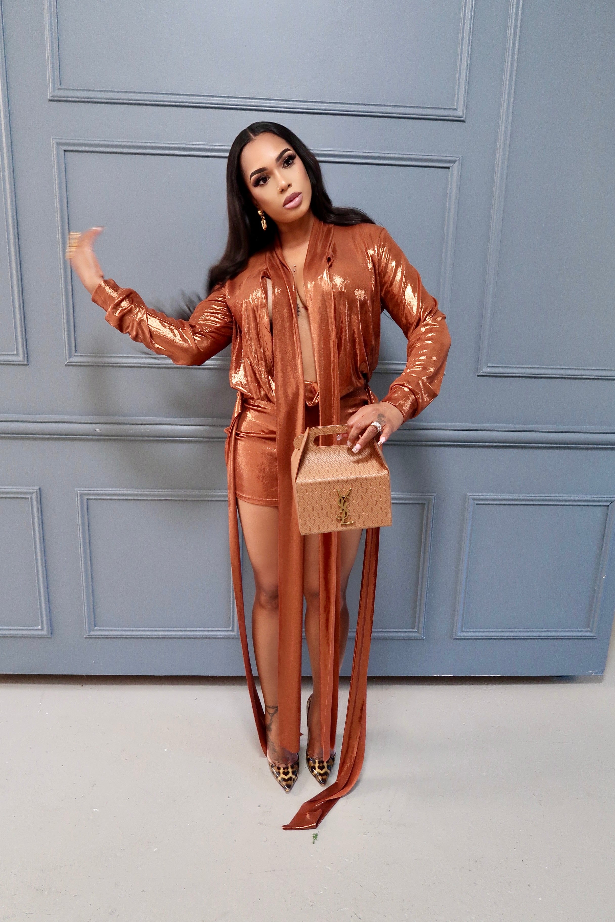 This two piece skirt set, called "Astor", offers a versatile and stylish addition to your wardrobe. With its sleek design and high-quality material, it provides both comfort and elegance for any occasion. Complete your look with this must-have set.