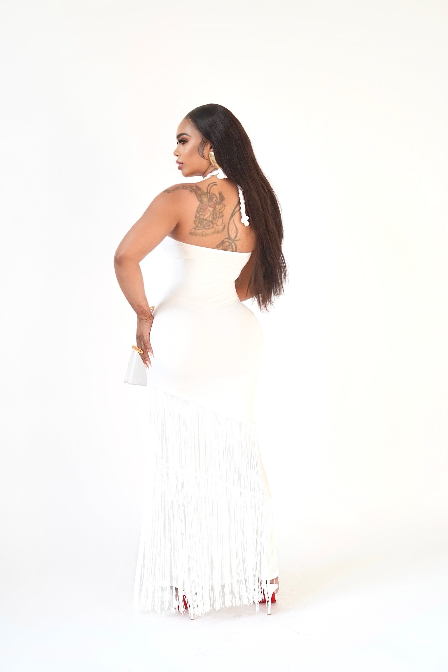 A white halter maxi dress featuring a bold center cutout and fringe detailing along the hemline. This design blends sleek glamour with playful movement for a show-stopping look.