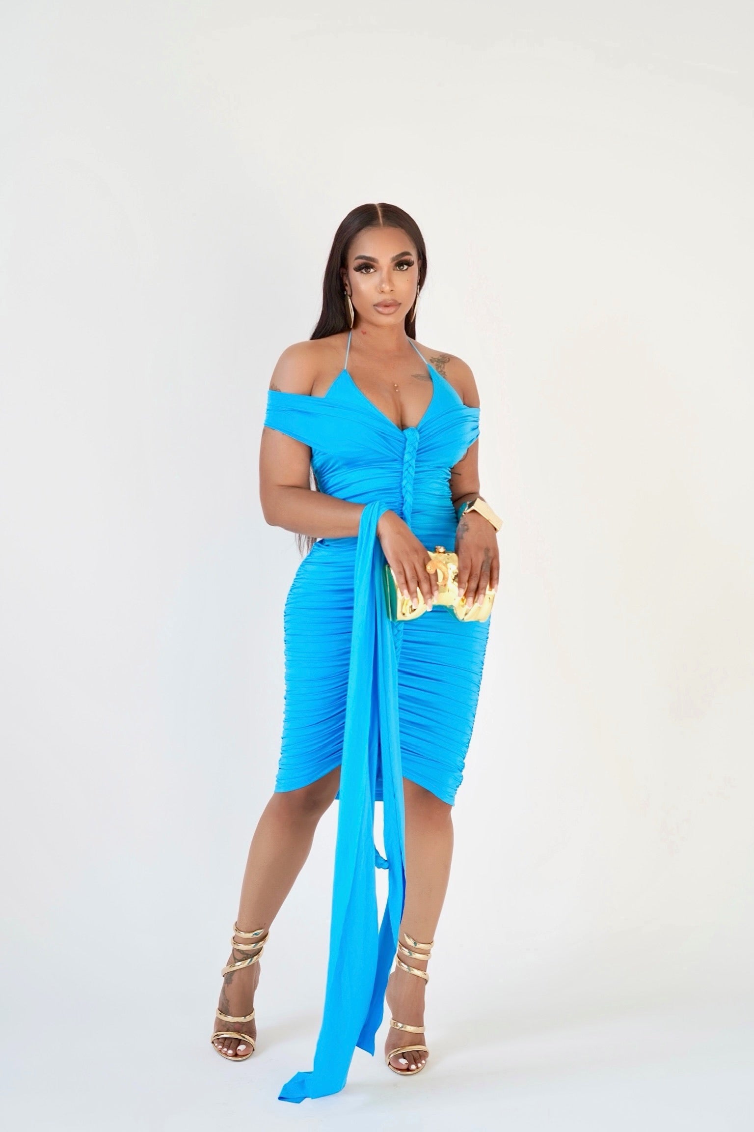 A striking electric blue midi dress with full-body ruching that contours the figure. Designed with an off-shoulder strap detail and a daring plunging neckline, it’s finished with a long braided fabric accent for a dramatic, fashion-forward edge.