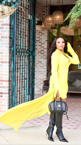 Get ready to have all eyes on you in this Lemon Drop Dress. Featuring a constructed corset design, a plunge neckline, figure hugging fit with floor-length train. Pair with heels and accessories for a flawless finish.